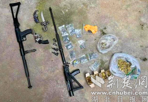 今年7月20日,隨縣公安局收到吳山鎮尹某涉槍線索,經綜合研判后,隨縣公安局刑警大隊聯合吳山派出所依法對尹某家突擊進行搜查,最后在其家儲藏室中發現3支疑似槍支(其中2支長槍、1支手槍);疑似子彈13顆、鉛彈頭500顆、射釘槍彈467顆;疑似槍支缺口2個、槍支連接件2個;蒙古龍刀1把、彈弓橡膠帶5條。