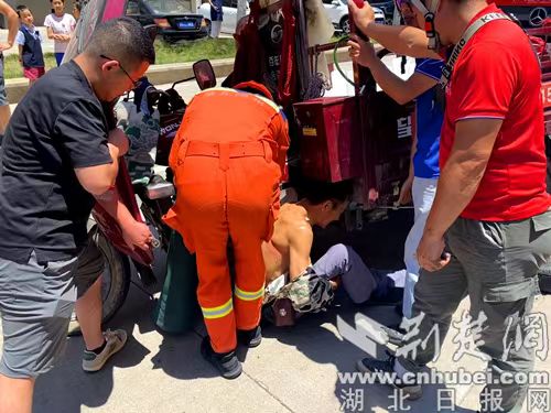 正午時分,烈日炎炎。消防員趕赴現場后發現,受傷男子表情痛苦、半身赤裸坐在地面,手臂彎折卡在三輪摩托車踏板處,旁邊有不少熱心市民托舉三輪車摩托車。