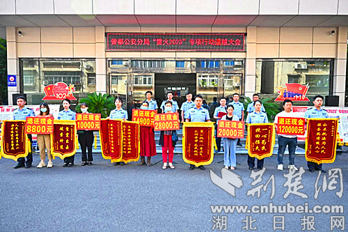 荊楚網(湖北日報網)訊(通訊員 覃言)8月29日,隨州市曾都公安分局舉行“雷火2023”專項行動退贓大會,展示曾都公安嚴厲打擊各類違法犯罪活動的決心和豐碩戰果。儀式現場,民警向22名群眾代表返還涉案現金以及手機等各類財務,價值總計150余萬元。