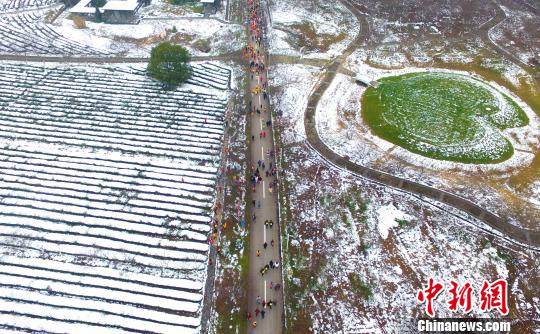 由于近日南昌降雪,積雪還未融化。當日,戶外寒風凜冽,氣溫在2至3℃徘徊。全長21.0975公里的比賽賽道,涵蓋了鄉村田園風光、森林自然景觀等。 劉占昆 攝