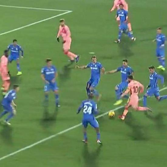 今夜對陣塞爾塔這一戰,梅西又一次制造出神圖!第26分鐘,梅西中路帶球向左側扯動,他一人就吸引了赫塔菲整條防線的注意力。在被對手6人從四面八方包夾的情況下,梅西仍然找到了唯一的傳球線路,他把球送給了左肋反越位的阿爾巴。阿爾巴橫傳中路,可惜皮克的近距離推射被索里亞撲出。