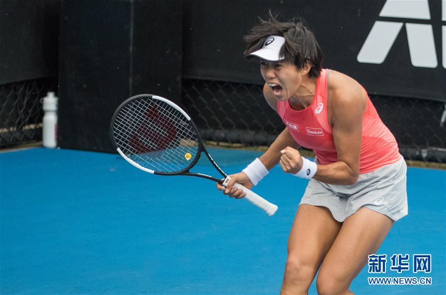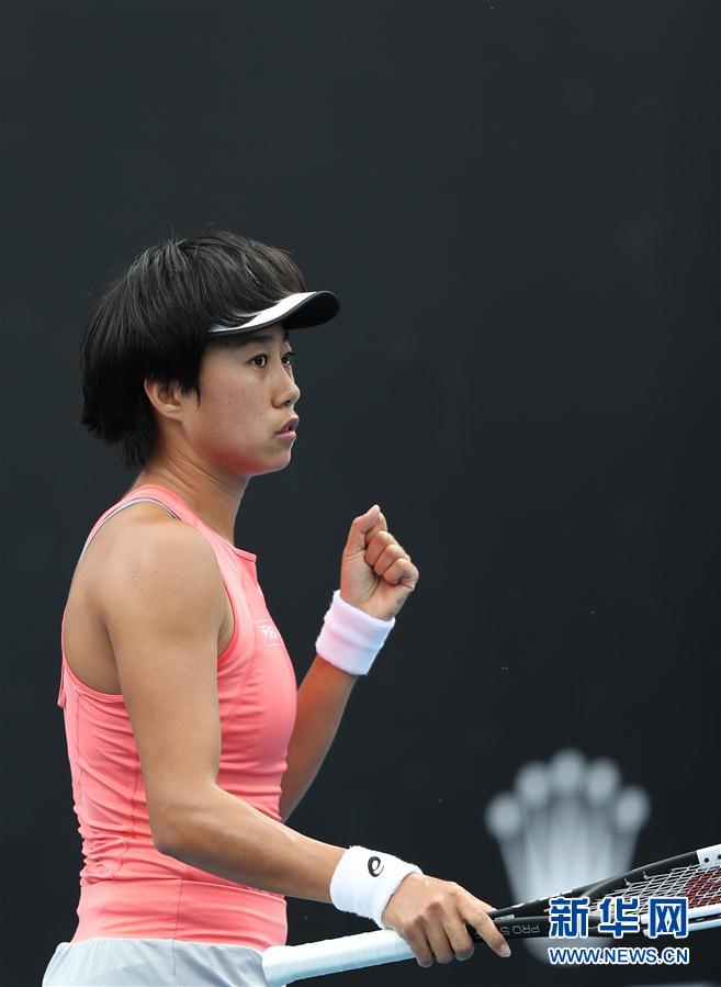 1月17日,張帥在比賽中慶祝得分。 當日,在2019澳大利亞網球公開賽女單次輪比賽中,中國選手張帥以2比0戰勝捷克選手普利斯科娃,晉級下一輪。 新華社發(胡涇辰攝)