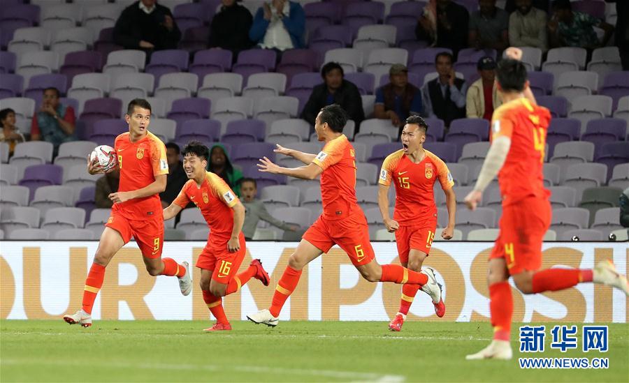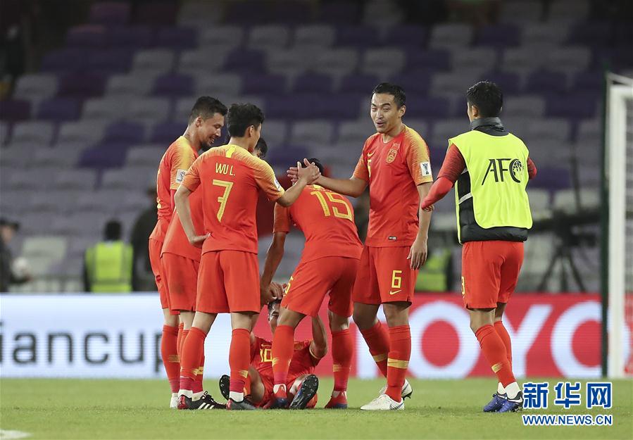 1月20日,中國隊球員肖智(左一)進球后和隊友慶祝。 當日,在阿聯酋艾因舉行的2019年亞洲杯足球賽八分之一決賽中,中國隊以2比1戰勝泰國隊,晉級八強。 新華社記者李鋼攝
