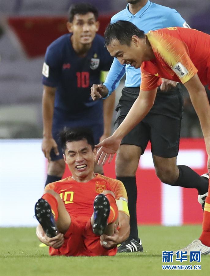 1月20日,中國隊球員在比賽后拉起倒地的鄭智慶祝勝利。 當日,在阿聯酋艾因舉行的2019年亞洲杯足球賽八分之一決賽中,中國隊以2比1戰勝泰國隊,晉級八強。 新華社記者曹燦攝