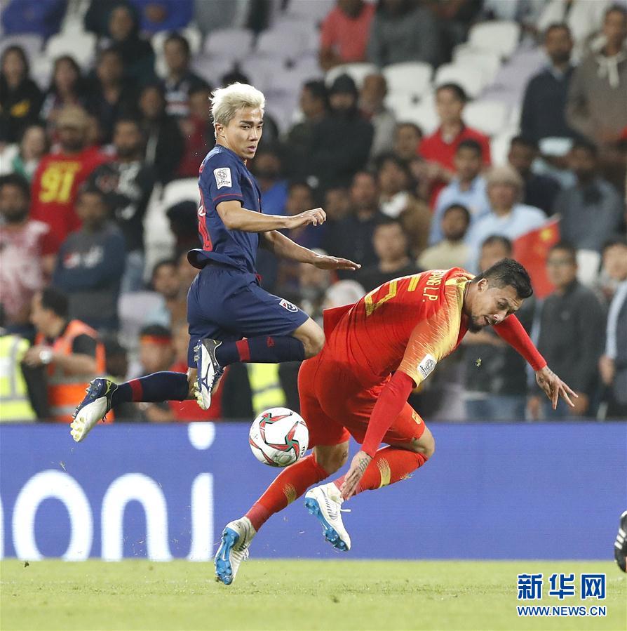 1月20日,中國隊球員張琳芃(右)與泰國隊球員猜納迪在比賽中拼搶。 當日,在阿聯酋艾因舉行的2019年亞洲杯足球賽八分之一決賽中,中國隊以2比1戰勝泰國隊,晉級八強。 新華社記者丁旭攝