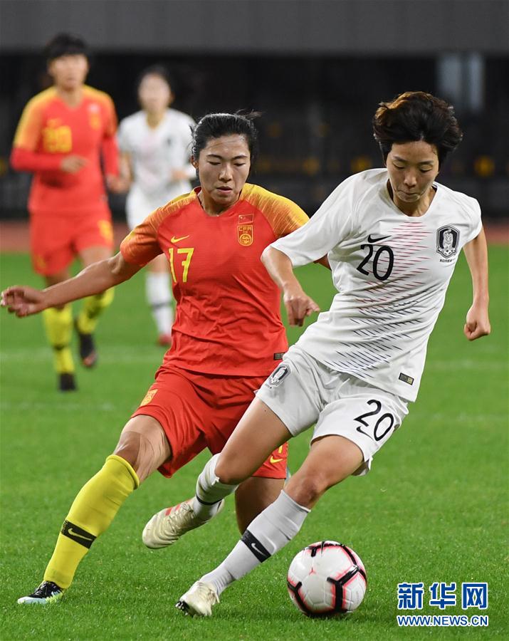1月20日,中國隊球員古雅沙(左)與韓國隊球員金惠利在比賽中拼搶。 當日,在廣東省梅州市五華縣舉行的國際女足錦標賽決賽中,中國隊以1比0戰勝韓國隊,獲得冠軍。 新華社記者鄧華攝