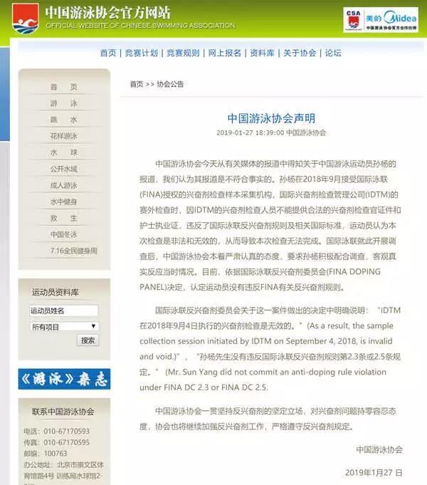 中國游泳協會今天從有關媒體的報道中得知關于中國游泳運動員孫楊的報道,我們認為其報道是不符合事實的。孫楊在2018年9月接受國際泳聯(FINA)授權的興奮劑檢查樣本采集機構,國際興奮劑檢查管理公司(IDTM)的賽外檢查時,因IDTM的興奮劑檢查人員不能提供合法的興奮劑檢查官證件和護士執業證,違反了國際泳聯反興奮劑規則及相關國際標準,運動員認為本次檢查是非法和無效的,從而導致本次檢查無法完成。國際泳聯就此開展調查后,中國游泳協會本著嚴肅認真的態度,要求孫楊積極配合調查,客觀真實反應當時情況。目前,依據國際泳聯反興奮劑委員會(FINA DOPING PANEL)決定,認定運動員沒有違反FINA有關反興奮劑規則。