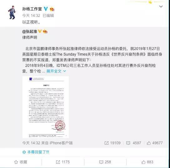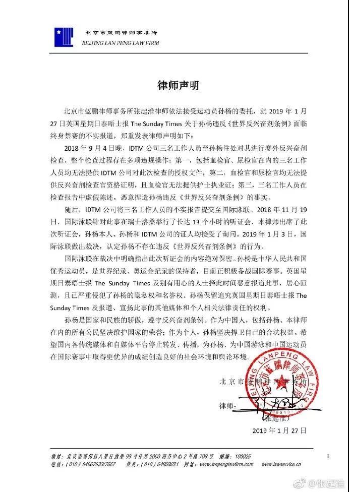 此前,孫楊委托律師張起淮在今天下午已經發布了律師聲明,澄清了《星期日泰晤士報》報道中所提及的所謂“孫楊攻擊興奮劑檢測人員”的事實真相,并表示,國際泳聯早在今年1月3日就已經做出裁決,孫楊并不存在違反《世界反興奮劑條例》的行為。