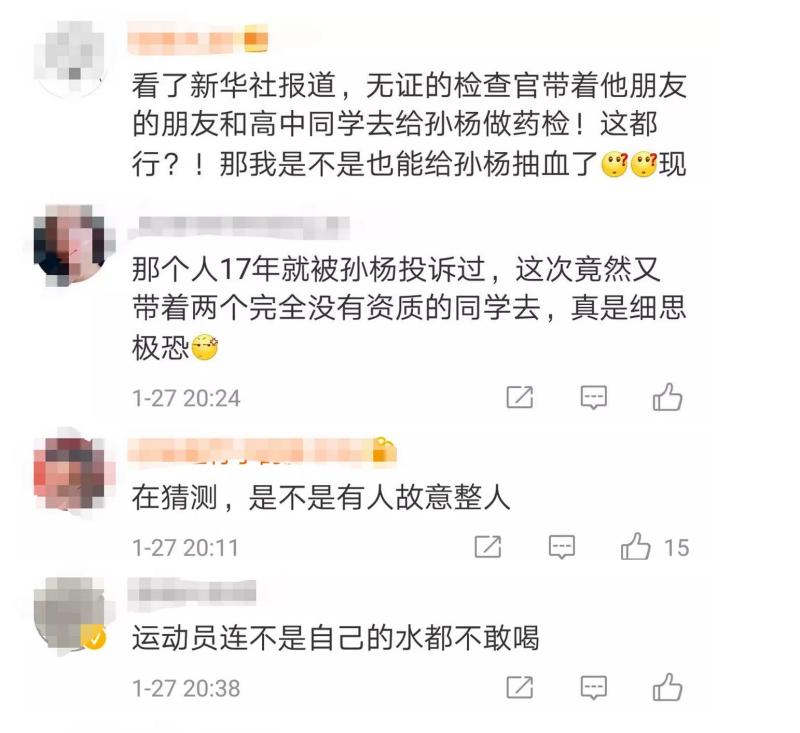 27日,孫楊律師張起淮介紹了更多被檢細節:在當晚的檢測中,主檢測官臨時找了兩個人分別擔任“血檢官”和“尿檢官”,“血檢官”是主檢測官朋友的朋友,沒有職業護士執業證,“尿檢官”是主檢測官的高中同學,而主檢測官在2017年10月對孫楊進行興奮劑檢測時,就因為沒有出示任何證件被孫楊投訴過。這些細節“嚇壞”網友:這都行?真是細思極恐...