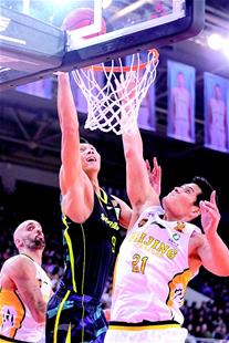 圖為:2017年CBA聯(lián)賽中,北京農(nóng)商銀行隊球員宋康明(右)在比賽中防守廣東東莞銀行隊球員易建聯(lián)的上籃。(資料圖片)