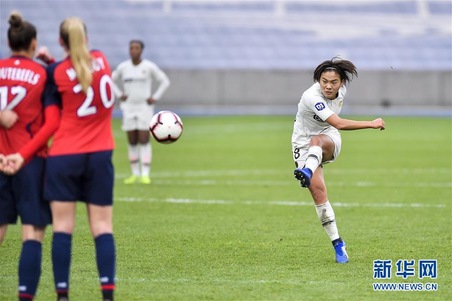 圖為2019年1月13日,王霜在法國里爾舉行的巴黎圣日耳曼對里爾的比賽中罰任意球。 新華社記者陳益宸攝