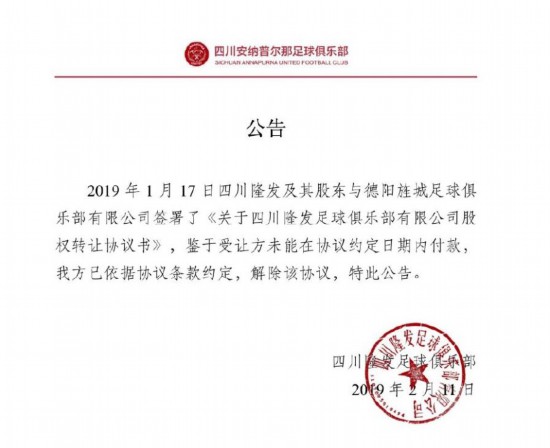 川足在公告中表示:“2019年1月17日四川隆發(fā)及其股東與德陽旌城足球俱樂部簽署了《關(guān)于四川隆發(fā)足球俱樂部公司股權(quán)轉(zhuǎn)讓協(xié)議書》,鑒于受讓方未能在協(xié)議約定日期內(nèi)付款,我方已依據(jù)協(xié)議條款約定,解除該協(xié)議。”