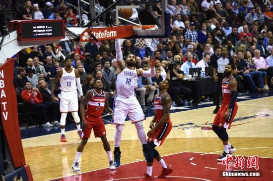 資料圖:雷霆(白)在比賽中。本賽季,在保羅·喬治和威少帶領(lǐng)下,雷霆目前排名西部第三。刁海洋 攝