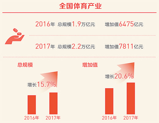 在經濟社會發展的強有力助推下,體育產業駛入了快車道。國家統計局與國家體育總局今年1月公布了《2017年全國體育產業總規模與增加值數據公告》。公告顯示,2017年,體育產業總規模為2.2萬億元,增加值7811億元,分別增長15.7%和20.6%,超出GDP增速不少。在體育產業高速前行中,越來越多的從業者認識到,體育產業是個“慢產業”,唯有腳踏實地耕耘才會有好的收獲。