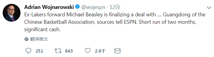 據(jù)美國著名記者沃納羅斯基發(fā)布推特透露,本賽季效力湖人的邁克爾-比斯利即將加入廣東男籃,他將會成為廣東隊大外援。按照此前馬尚-布魯克斯替換德萊尼的消息,廣東隊或許將組成馬尚-布魯克斯+比斯利的超強(qiáng)外援組合沖擊總冠軍。