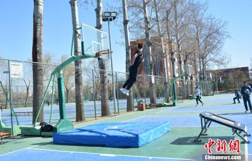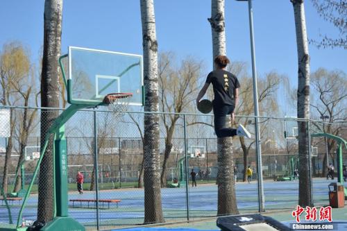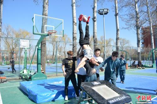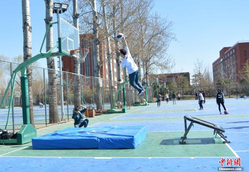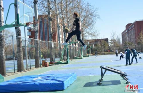中新網(wǎng)客戶端北京4月1日電(邢蕊)遠(yuǎn)距離助跑,再借助蹦床的彈力,拿著籃球的小伙兒在空中旋轉(zhuǎn)一圈后,穩(wěn)穩(wěn)的將球送進(jìn)了框中。