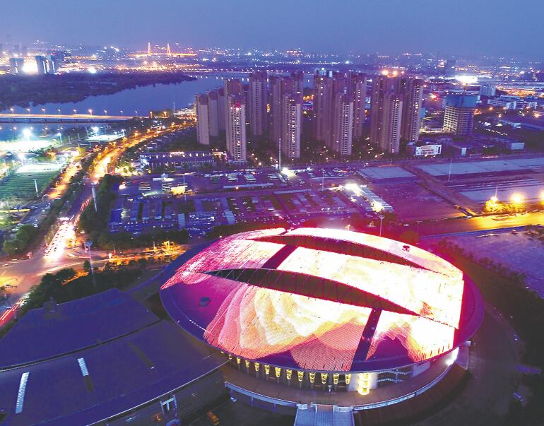 17日晚,為了迎接軍運會的到來,位于沌口的武漢體育館經過景觀燈亮化提升,其頂部及立面出現不同燈光圖案,五光十色的燈光營造出一幅幅絢麗多彩的畫面。(長江日報記者李子云攝影報道)