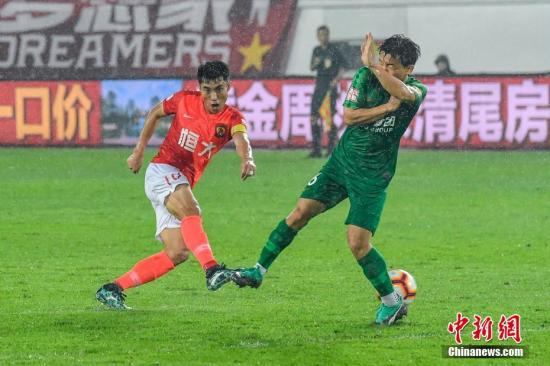 資料圖:在天河體育場的雨幕里,廣州恒大(紅)主場不敵北京國安(綠),與對手的積分差距來到6分之多。 中新社記者 陳驥旻 攝