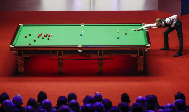 ↑圖為2019年5月6日,特魯姆普在世界斯諾克錦標賽決賽第三階段比賽中。新華社記者韓巖攝