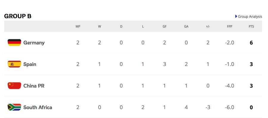 4天之后,中國隊將迎來小組賽的最后一個對手西班牙女足,后者首戰取勝后本輪0:1不敵德國。B組目前的積分形勢已經相對明朗,兩戰全勝的德國隊積6分暫居小組第一,提前一輪獲得出線資格,而她們末輪的對手則是兩戰皆墨的南非。而同樣一勝一負積3分的中國與西班牙即將上演排位爭奪戰。