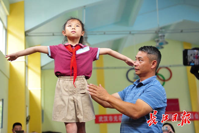 6月14日,由軍運(yùn)會(huì)體操項(xiàng)目競(jìng)賽委員會(huì)組織的“體操冠軍光谷行”活動(dòng),走進(jìn)光谷六小。李小雙現(xiàn)場(chǎng)指導(dǎo)動(dòng)作。記者彭年 攝