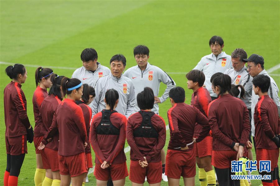 6月19日,中國隊主教練賈秀全(后排左二)在訓練前與隊員交流。 當日,中國女足隊員在法國勒阿弗爾訓練,備戰2019年國際足聯女足世界杯16強賽。 新華社記者徐子鑒攝