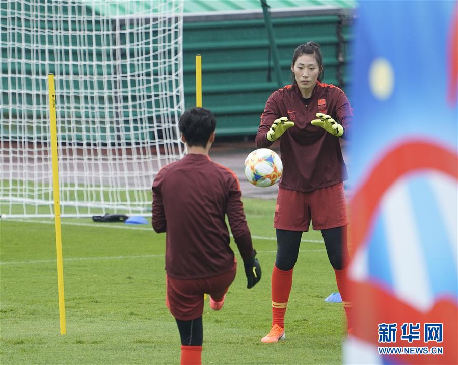 6月19日,中國隊守門員彭詩夢(右)與畢曉琳在訓練中。 當日,中國女足隊員在法國勒阿弗爾訓練,備戰2019年國際足聯女足世界杯16強賽。 新華社記者丁旭攝