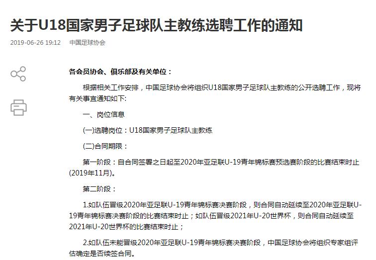 據了解,競選U18國家男子足球隊主帥的報名時間為即日起至2019年6月30日24時止,面試時間為2019年7月4日-5日。(完)
