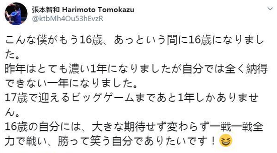 盡管壓力巨大,但在自己16歲生日之際,張本智和還是給自己加油打氣,“我已經(jīng)16歲了,不知不覺就到了16歲,去年對我來說是非常難以置信的一年,距離即將在我17歲時(shí)迎來的那場大賽(東京奧運(yùn)會)還有一年的時(shí)間,對于即將到來的16歲,我會毫不猶豫地拼盡全力面對每一場比賽,爭取獲得更多的勝利和歡笑。”
