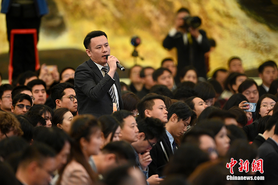 3月15日,十三屆全國人大二次會議閉幕后,中國國務院總理李克強在北京人民大會堂金色大廳會見采訪十三屆全國人大二次會議的中外記者并回答記者提出的問題。圖為中國新聞社記者提問。 中新社記者 侯宇 攝