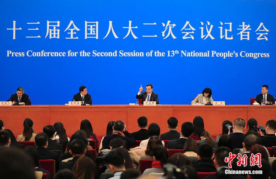 3月15日,十三屆全國人大二次會議閉幕后,中國國務院總理李克強在北京人民大會堂金色大廳會見采訪十三屆全國人大二次會議的中外記者并回答記者提出的問題。 中新社記者 杜洋 攝