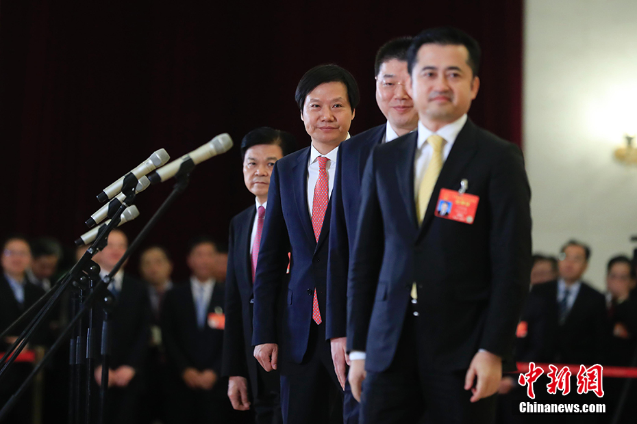 3月15日,十三屆全國人大二次會議在北京人民大會堂舉行閉幕會。圖為全國人大代表雷軍(左二)等在“代表通道”接受采訪。 中新社記者 杜洋 攝