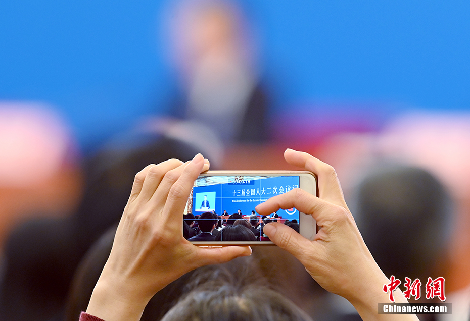 3月15日,十三屆全國人大二次會議閉幕后,中國國務院總理李克強在北京人民大會堂金色大廳會見采訪十三屆全國人大二次會議的中外記者并回答記者提出的問題。圖為一名記者用手機拍攝現場。 中新社記者 侯宇 攝