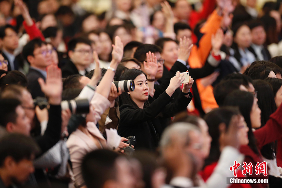 3月15日,十三屆全國人大二次會議閉幕后,中國國務院總理李克強在北京人民大會堂金色大廳會見采訪十三屆全國人大二次會議的中外記者并回答記者提出的問題。圖為記者現場采訪。 中新社記者 杜洋 攝
