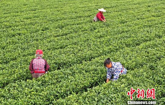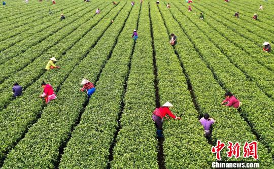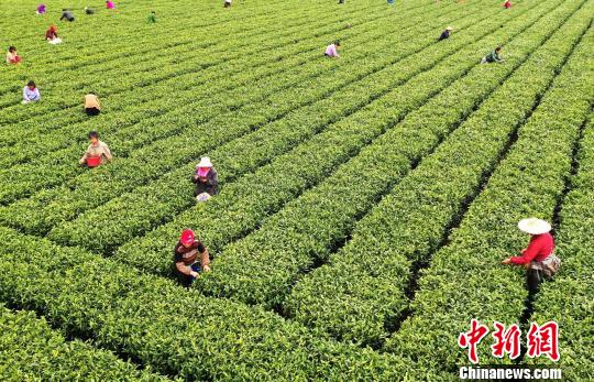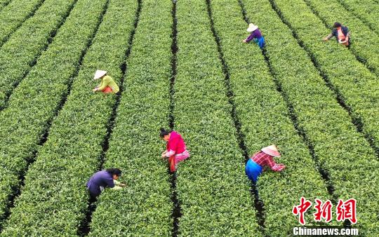 無人機航拍下的各地茶園茶農采摘春茶畫面。 郭弘毅 攝
