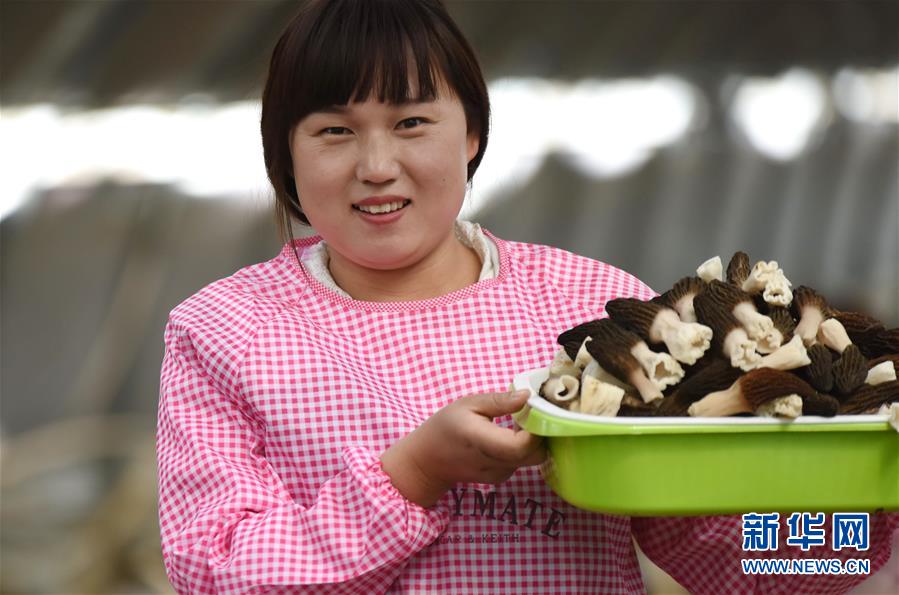 3月30日,隆堯縣大張莊鄉郝家莊村一家庭農場工人展示采收的羊肚菌。新華社記者 朱旭東 攝