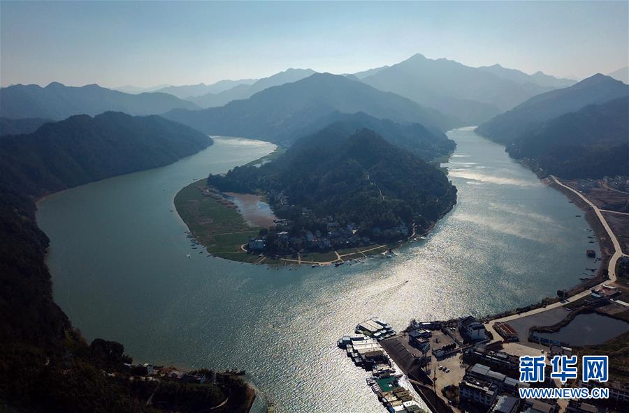 1月18日在安徽省黃山市歙縣拍攝的新安江山水畫廊美景(無人機拍攝)。新華社發(施亞磊 攝)