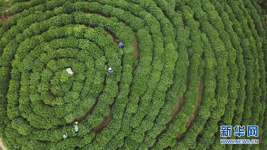 4月16日,茶農在安徽黃山市黃山區猴坑村一處茶園內采茶(無人機拍攝)。新華社記者 張端 攝