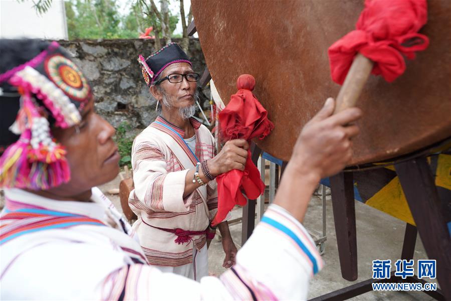 6月14日,白臘先(右)和合作社村民敲擊做好的基諾大鼓聽音。 在云南省西雙版納傣族自治州景洪市基諾山基諾族鄉(xiāng)巴坡村,省級非物質(zhì)文化遺產(chǎn)傳承人白臘先帶領(lǐng)村民成立“制作大鼓及手工藝品專業(yè)合作社”,專門傳授基諾大鼓制作工藝,讓這門工藝得以傳承。 新華社記者秦晴攝