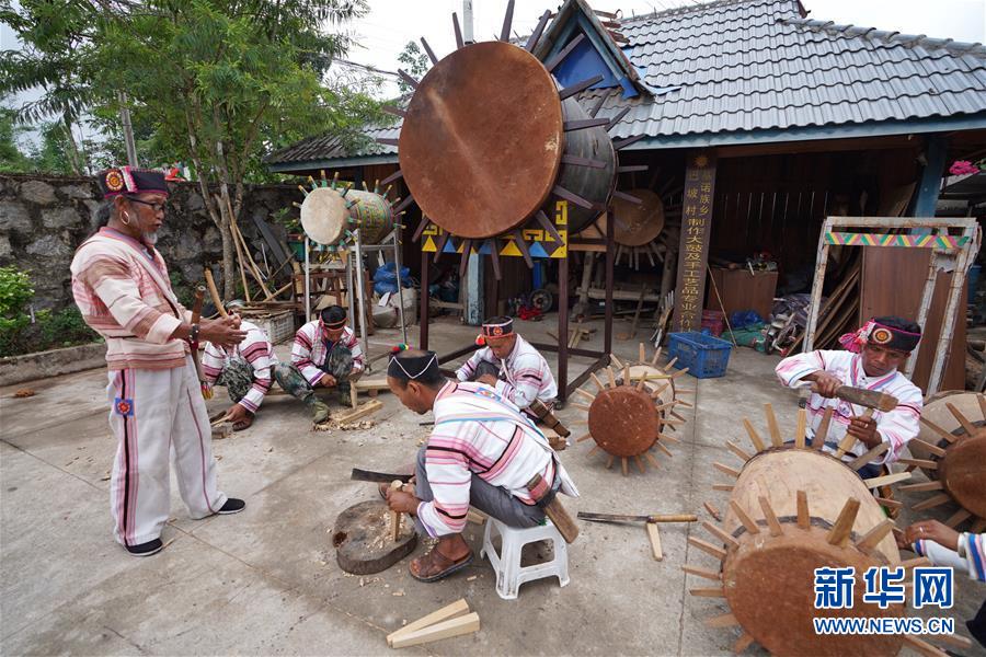 6月14日,白臘先(左一)指導(dǎo)合作社村民制作基諾大鼓。 在云南省西雙版納傣族自治州景洪市基諾山基諾族鄉(xiāng)巴坡村,省級非物質(zhì)文化遺產(chǎn)傳承人白臘先帶領(lǐng)村民成立“制作大鼓及手工藝品專業(yè)合作社”,專門傳授基諾大鼓制作工藝,讓這門工藝得以傳承。 新華社記者胡超攝
