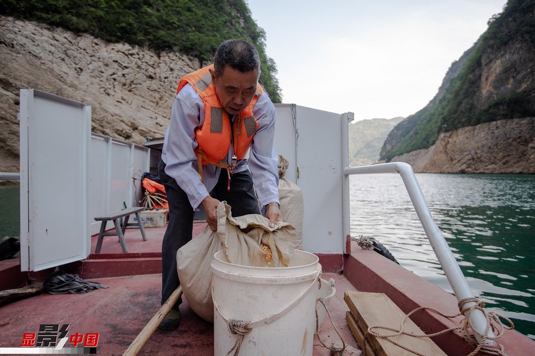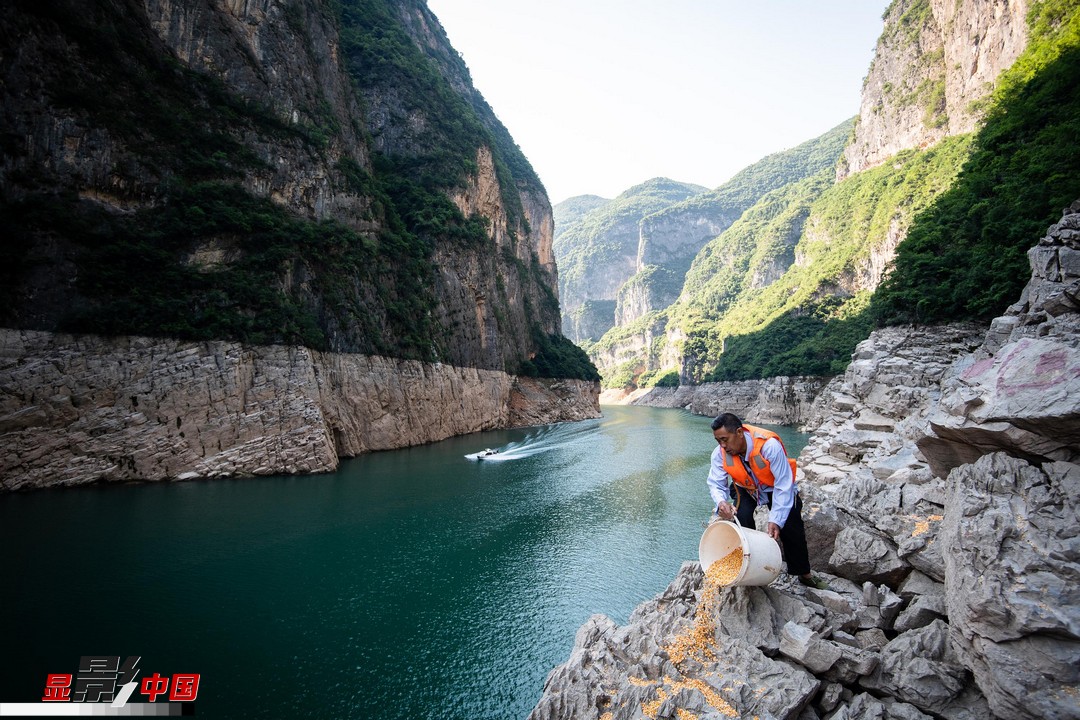 55歲的代光群每周二清晨6點便已置身于大寧河上,乘船駛向小三峽腹地,途經巴霧峽、懸棺、趙門子、滴翠峽四個猴糧投放點,給小三峽所有的猴群投喂食物,寒來暑往從不間斷,一干就是15年。新華網 李相博攝