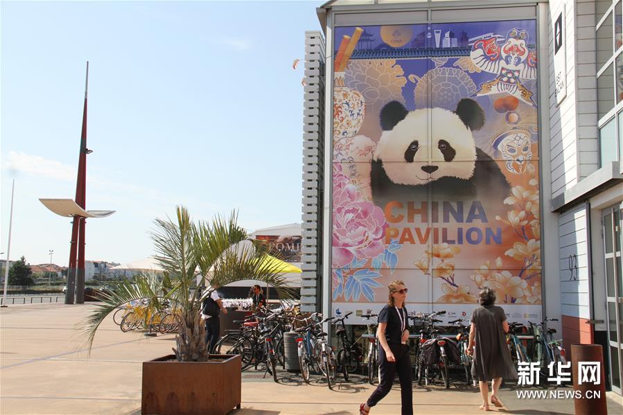 6月25日,在法國拉羅謝爾,參展者從中國聯合展臺的海報前走過。新華社記者 楊一苗 攝