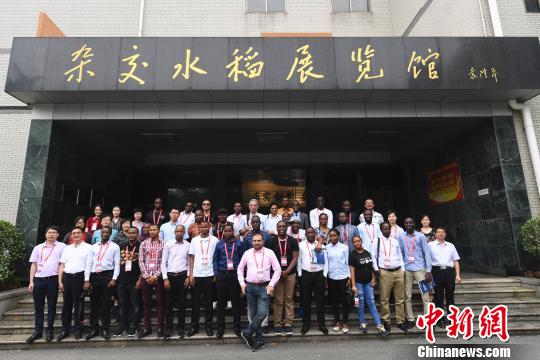 非洲記者與工作人員在雜交水稻展覽館前合影。 楊華峰 攝