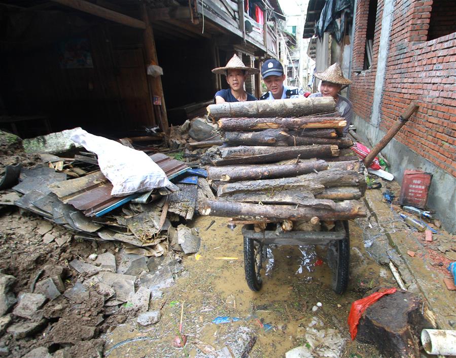 7月6日,在福建省順昌縣仁壽鎮橋下村,派出所民警與村民一起清理山洪帶來的垃圾。 今年我國首個登陸臺風“木恩”于7月3日在海南萬寧和樂鎮沿海登陸。受其外圍云系帶來的影響,福建省順昌縣出現強降雨,局部地區暴發山洪和泥石流災害。目前,當地居民正積極開展生產自救。 新華社發(陳柏材 攝)