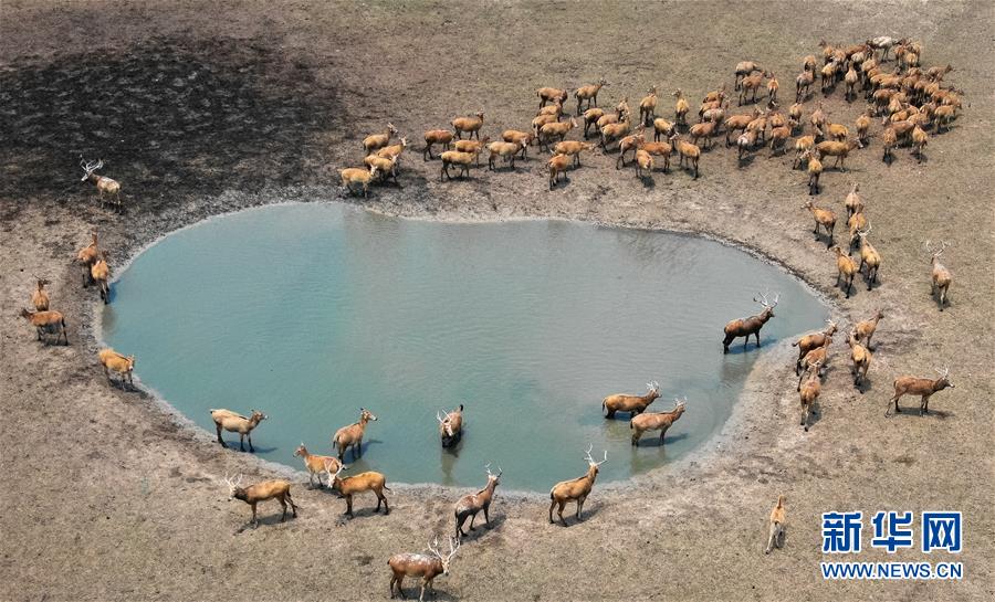 6月28日在江蘇大豐麋鹿國家級自然保護區拍攝的一群在水塘附近棲息的麋鹿(無人機拍攝)。 近年來,隨著生態環境的改善和動物保護力度的加大,江蘇大豐麋鹿國家級自然保護區麋鹿的繁衍生息獲得優越的外部條件,目前種群總數已達5016頭。2019年,保護區的麋鹿成功產仔800多頭,為種群注入新的活力。 新華社記者 李響 攝