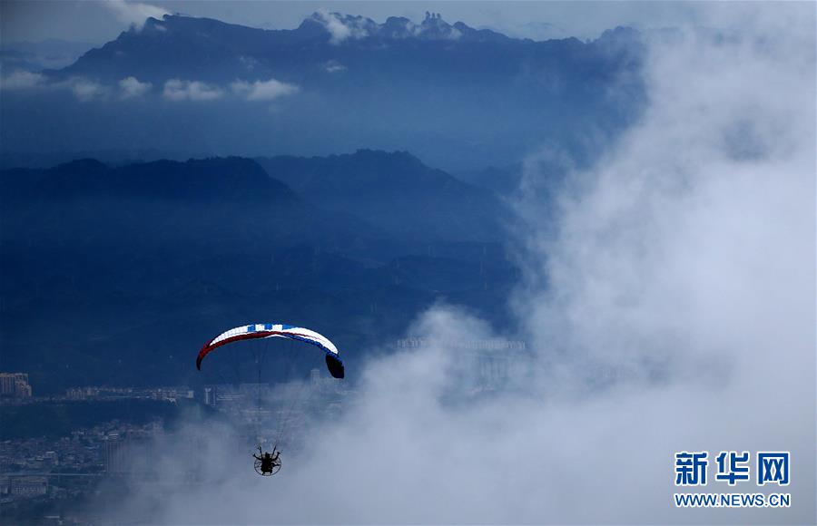 6月30日,選手在參加動力傘特技國際大師賽。 當日,“極限飛蕩”動力傘特技國際大師賽在湖南張家界天門山景區落下帷幕。 新華社發(周國強 攝)