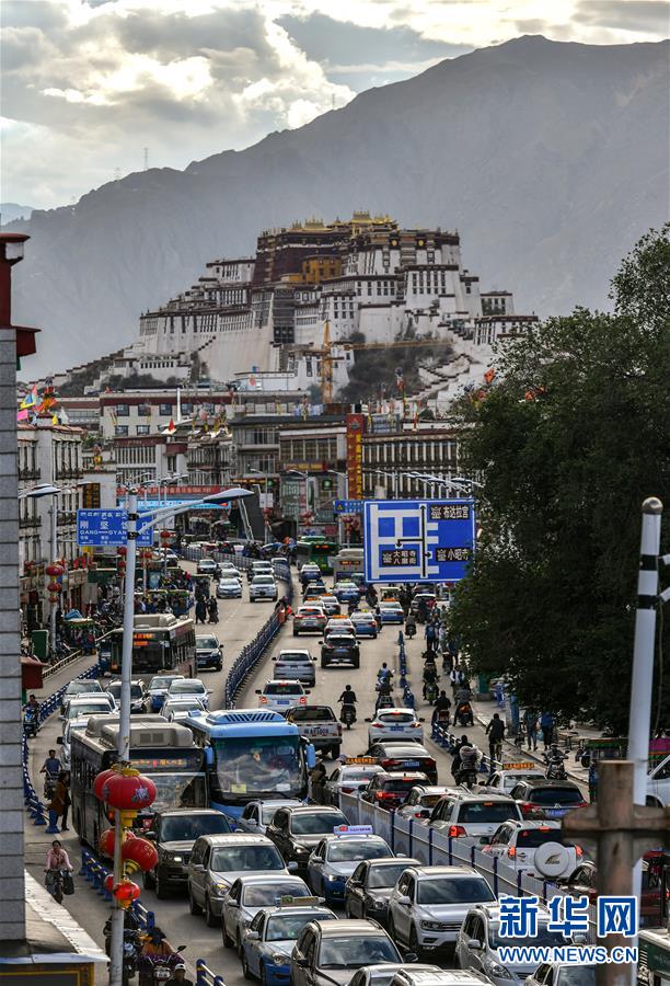 拉薩大街上車來車往(7月4日攝)。 截至目前,西藏拉薩市機動車保有量突破26萬輛。2019年1月至今,日均新車上戶126輛,汽車正加快駛入高原平常人家。 新華社記者 李鑫 攝