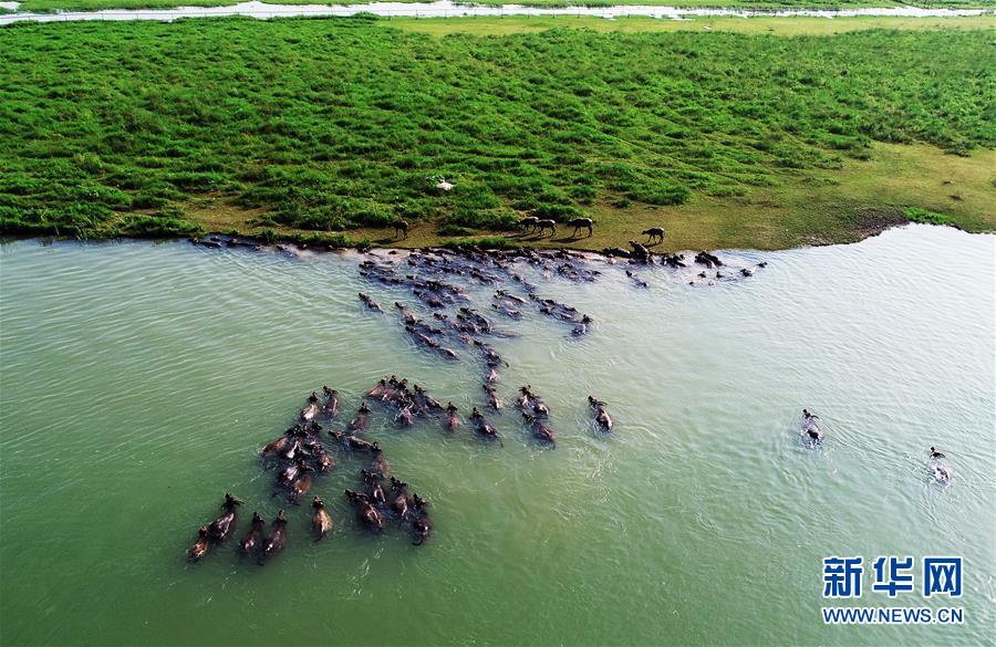 7月2日,在四川省南充市蓬安縣油房溝村,百余頭水牛橫渡嘉陵江到江心島吃草(無人機拍攝)。 新華社發(劉永紅 攝)
