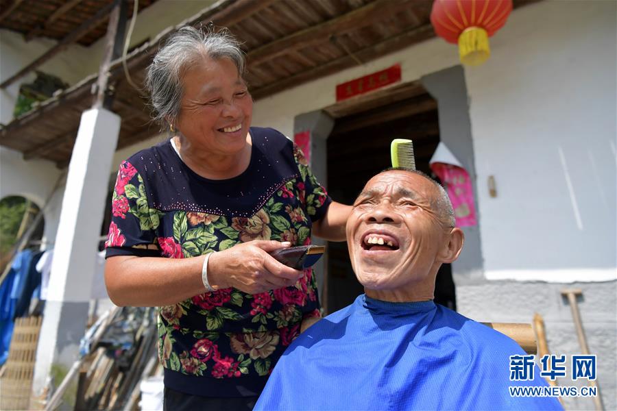 在江西省南昌市灣里區太平鎮南溪村,戴玲香為李克訓剃頭,老人很開心(6月26日攝)。