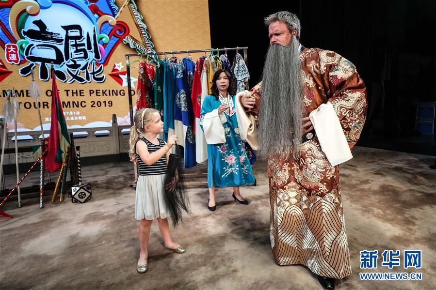 7月1日,參加活動的嘉賓體驗京劇服飾。 當日,世界經濟論壇第十三屆新領軍者年會(夏季達沃斯論壇)主辦方為參會嘉賓推出了京劇文化游活動。嘉賓們在活動中觀看京劇表演并進行親身體驗,近距離了解京劇文化。 新華社記者潘昱龍攝